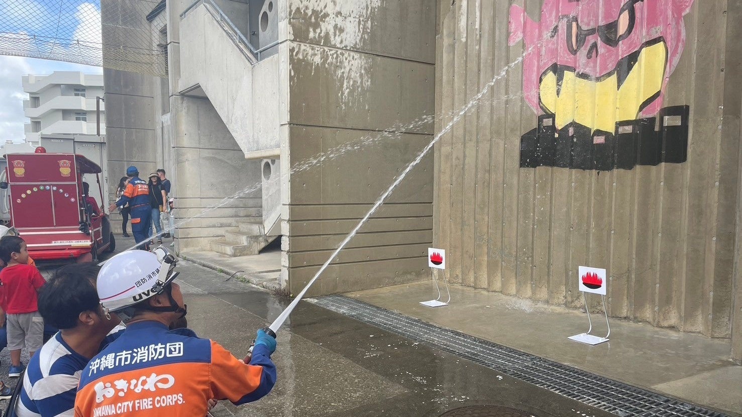 10月26日(土)は、沖縄市消防本部にて開催された「沖縄市市制施行50周年記念 沖縄市消防救急フェア」に参加しました。沖縄市PRキャラクターの「エイ坊」と一緒に、消防車乗車体験や消火体験などを通して来場者と交流を行いました。