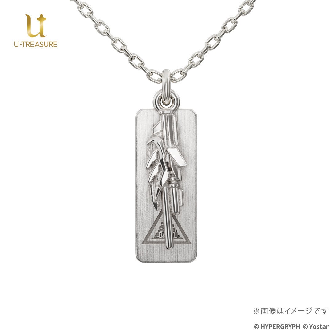 シヴィライト・エテルナの武器をチャームのデザインに落とし込んだプレートネックレス。プレート部分には所属陣営(ロドス)のエンブレムを刻印しました。