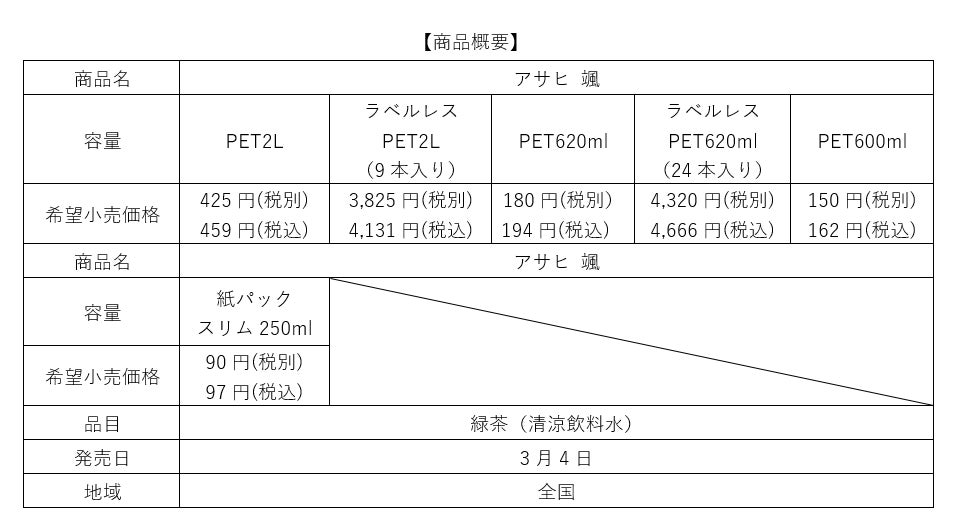 アサヒ飲料株式会社(本社 東京、社長 米女太一)は、緑茶ブランド『アサヒ 颯』を3月4日からリニューアル発売します。