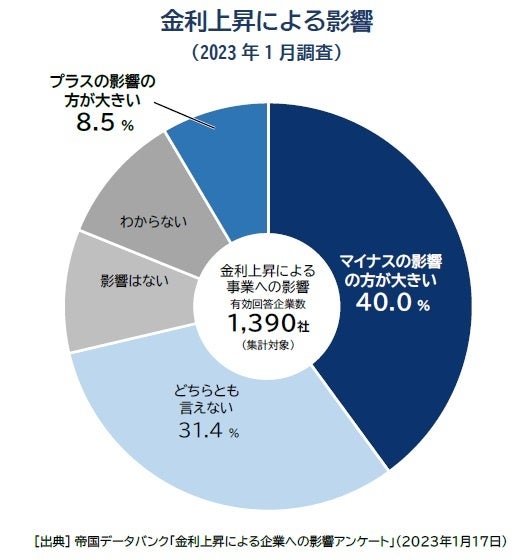 帝国データバンクが「マイナス金利撤廃」の議論が本格化する前の昨年1月、金利上昇による事業への影響について1390社を対象に調査した結果、金利上昇により「マイナスの影響が大きい」と回答した企業が40.0%を占めた。足元では、借り換えなどの場面において「すでに足元の貸出金利は上がっている」とする金融機関もあり、「マイナスの影響」を実感する企業はさらに増加している可能性がある。