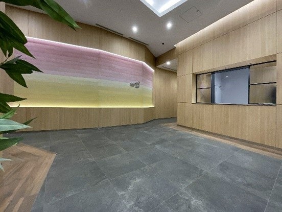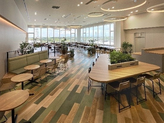内装は、四季をコンセプトに、各階で異なるテーマカラーを設け、共用廊下・EVホール等をデザイン。5階最上階は「スカイラウンジ」として、ハイサッシから筑波山を臨むことのできる、天高約4.5mの開放感ある空間とし、入居企業の従業員が心地よく休憩可能なスペースに仕上げています。また、エントランスには折上げ天井と壁面の一部に、つくばみらい市の木である桜と、市の花である菜の花をイメージしたグラデーションのある左官を施し、落ち着いた風合いで従業員を出迎えます。