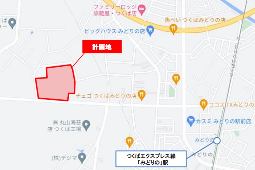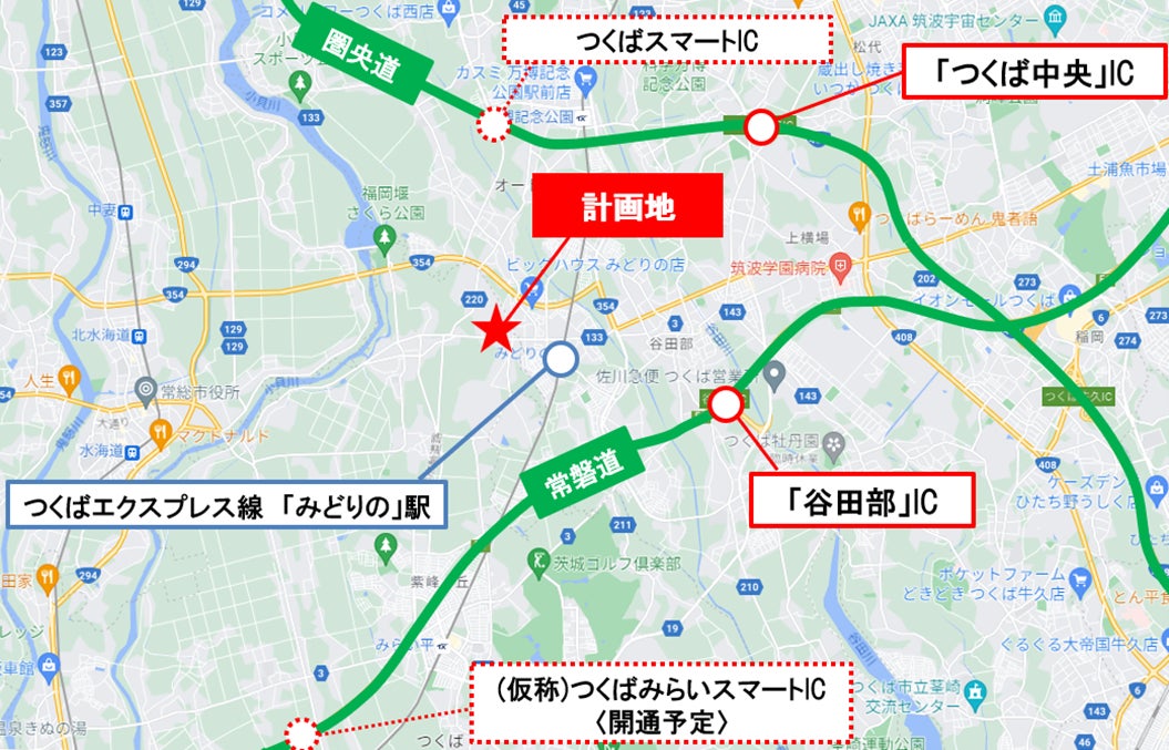 「MFLPつくばみらい」は、常磐自動車「谷田部」ICから約4.0km、圏央道「つくば西」SICから約3.6kmに位置し、国道354号線へのアクセスも可能です。常磐道を利用し東京都心まで約1時間30分程度で配送が可能で、東北エリアへの配送も対応できます。圏央道を利用することで関東近郊へもアクセスが良く、広域配送にも適しています。また、つくばエクスプレス「みどりの」駅から徒歩15分と公共交通機関による通勤利便性も高く、入居企業の人材確保においても優位性のある立地です。