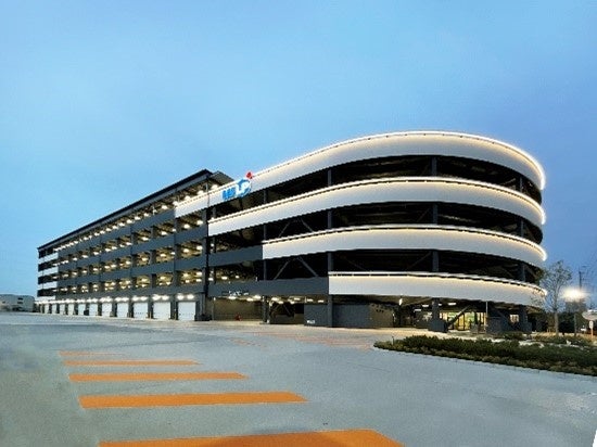 外装は、県道沿いのランプウェイ部分を活かしたデザインを行い、トップレールとライン照明を組み合わせたダイナミックかつ夜間にも存在感のあるファサードを実現しました。