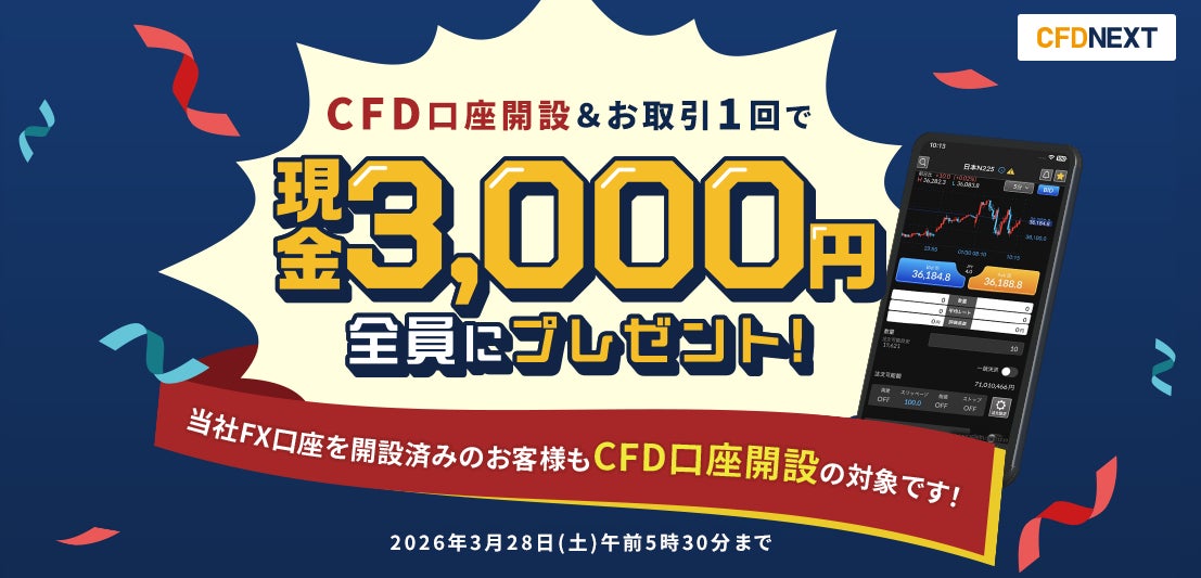 株式会社外為どっとコム(本社:東京都港区、代表取締役社長:竹内 淳)は、『CFDネクスト』におきまして、2026年3月2日(月)より「口座開設&お取引1回でもれなく現金3,000円をプレゼント!キャンペーン」を実施します。