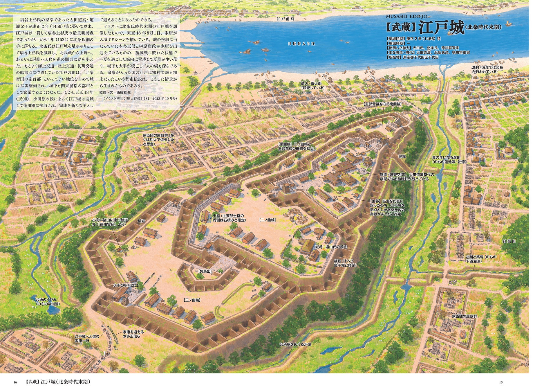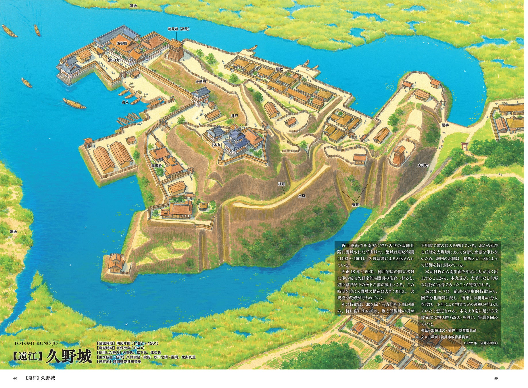 【陸奥】弘前城、【陸奥】厨川柵、【陸奥】仙台城 本丸御殿、【武蔵】鉢形城と荒川の支城網、【武蔵】江戸城(北条時代末期)、江戸城 本丸と二の丸(寛永期)、江戸城 寛永期天守(断面)、【相模】鎌倉、【相模】衣笠城合戦、【信濃】上田城と周辺、【信濃】松本城、【信濃】真田本城、【信濃】林城、【信濃】小諸城、【飛騨】高山城 本丸御殿(透視)、【飛驒】小鷹利城(三木氏時代)、【美濃】大垣城 天守(断面)、【美濃】岩村城下、【美濃】岩村城、【美濃】松尾山城、【美濃】岐阜城 山上曲輪、【美濃】大桑城、【美濃】菩提山城、【駿河】今川義元館、【駿河】賤機山城、【遠江】掛川城攻め付城群、【遠江】久野城、【三河】岩略寺城、【三河】船形山城、【三河】上ノ郷城、【三河】長篠城、【尾張】勝幡城、【尾張】小牧山城、【近江】虎御前山砦、【山城】北白川城塞群、【山城】旧二条城、二条城(慶長期)、山科本願寺、大坂城(寛永期)、【摂津】尼崎城、【摂津】尼崎城 天守、【摂津】高槻城(織豊期)、【大和】信貴山城、【播磨】姫路城 天守(断面)、【播磨】姫路城、【因幡】若桜鬼ヶ城、【伯耆】羽衣石城陣城群、【出雲】松江城、【出雲】月山富田城(尼子時代)、【石見】三宅御土居、【備前】岡山城、【備中】高松城、【備後】福山城、【安芸】広島城、【阿波】勝瑞城、【阿波】一宮城、【伊予】世田山城の戦い、【伊予】湯築城(初期)、【伊予】湯築城(戦国末期)、【伊予】湊山城の戦い、【伊予】宮窪城、【豊前】小倉城、【豊前】松山城、【豊後】佐伯城(創建時)、【豊後】佐伯城(江戸時代中期 1740年頃)、【肥後】熊本城 本丸 大小天守、吉野ケ里遺跡、【琉球王国】中城グスク(南西から)、【琉球王国】中城グスク(北東から)、山城模式図、その他に天守・櫓なども掲載。