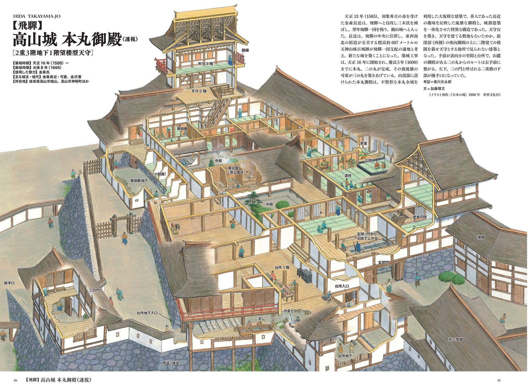 見るべき方向と角度にこだわって鳥瞰で描かれるイラストでは、河川などの自然地形を生かした縄張の工夫が一目瞭然。また、断面・透視イラストからは、巨大な天守の複雑な内部構造を知ることができます。