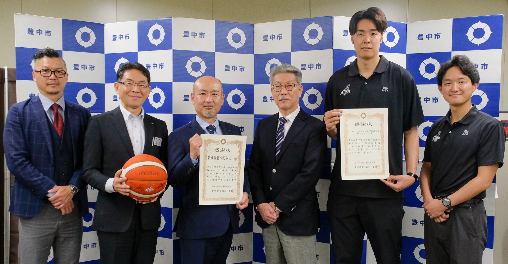 豊中市は、朝日電装株式会社、大阪エヴェッサから、全市立中学校17校(義務教育学校1校を含む)に、各校4球ずつ、計68球のバスケットボールを寄贈いただきました。これを受けて、豊中市教育長より感謝状を贈呈しました。