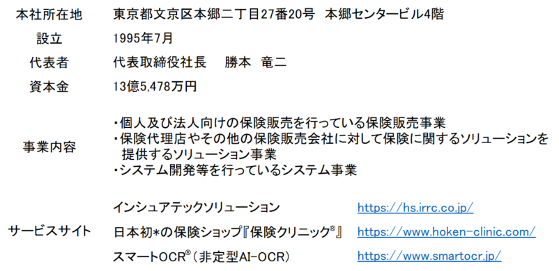 インシュアテックソリューション https://hs.irrc.co.jp/ 日本初*の保険ショップ『保険クリニック®』 https://www.hoken-clinic.com/ スマートOCR®(非定型AI-OCR) https://www.smartocr.jp/ |