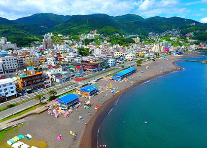 伊東オレンジビーチは、温泉街の目の前に広がり、ヤシの木が南国気分を演出する美しい海岸です。海水浴シーズンには4軒の海の家が営業し、お食事を楽しんだり、シャワーも完備しています。バナナボートのマリンアクティビティもお楽しみいただけます。