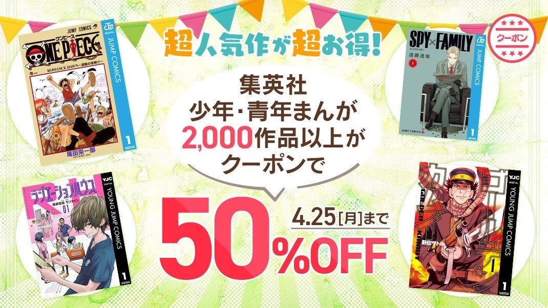 『ONE PIECE』や『SPY×FAMILY』など4,000作品以上がクーポンで50%OFF!「集英社×ebookjapan 春マン!! 2022 クーポンキャンペーン」が4月16日からスタート!