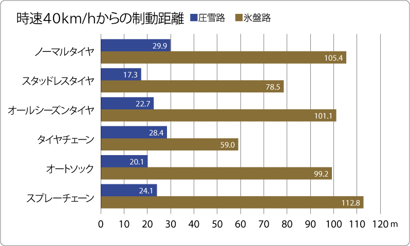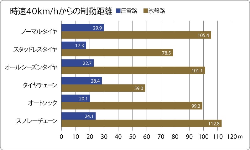 結果は雪道でのノーマルタイヤの制動距離は29.9mでスタッドレスタイヤの17.3mに対して約1.7倍でした。降雪が予想される地域へお出かけの際はタイヤチェーンやスタッドレスタイヤのご準備を。