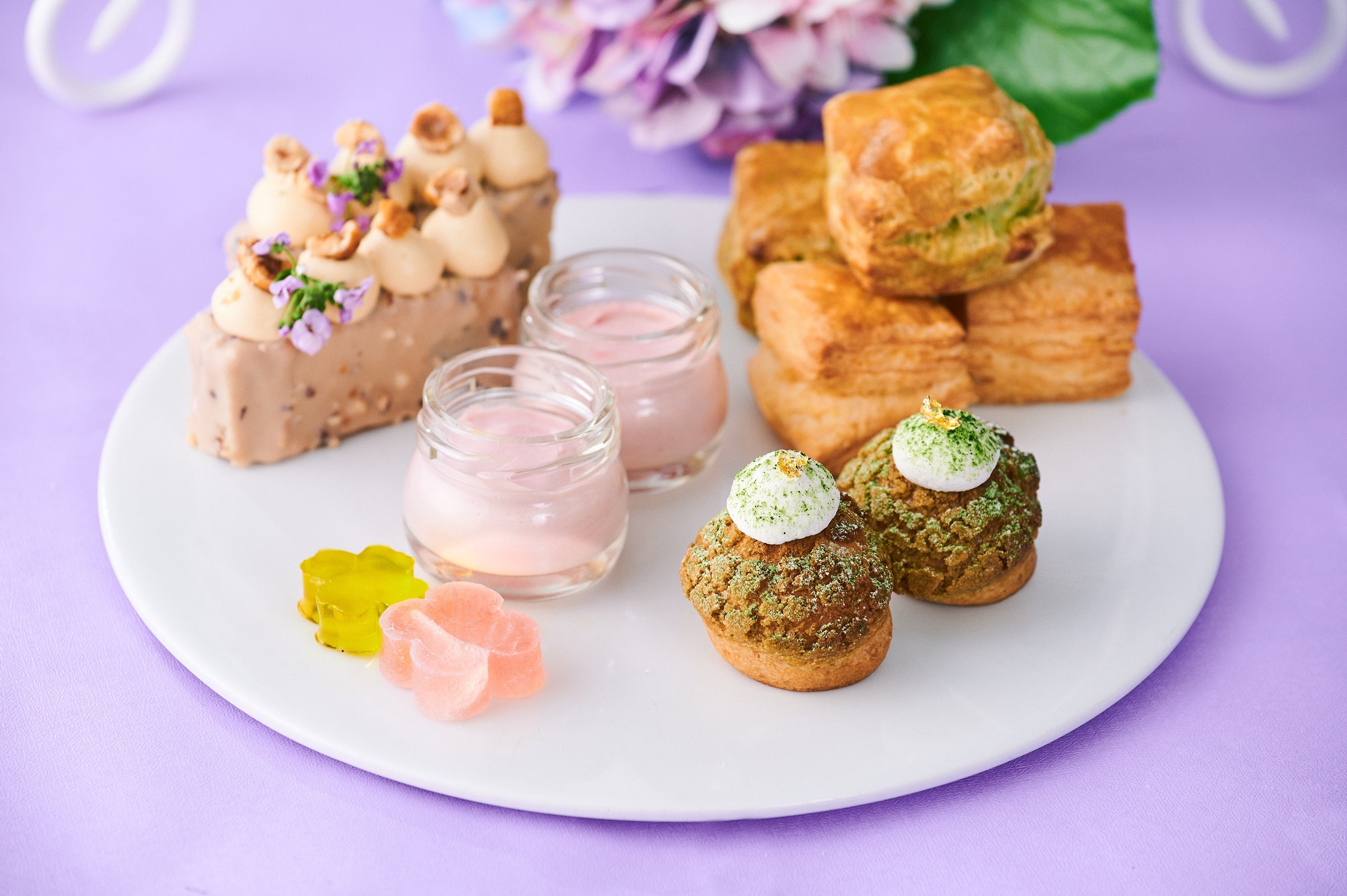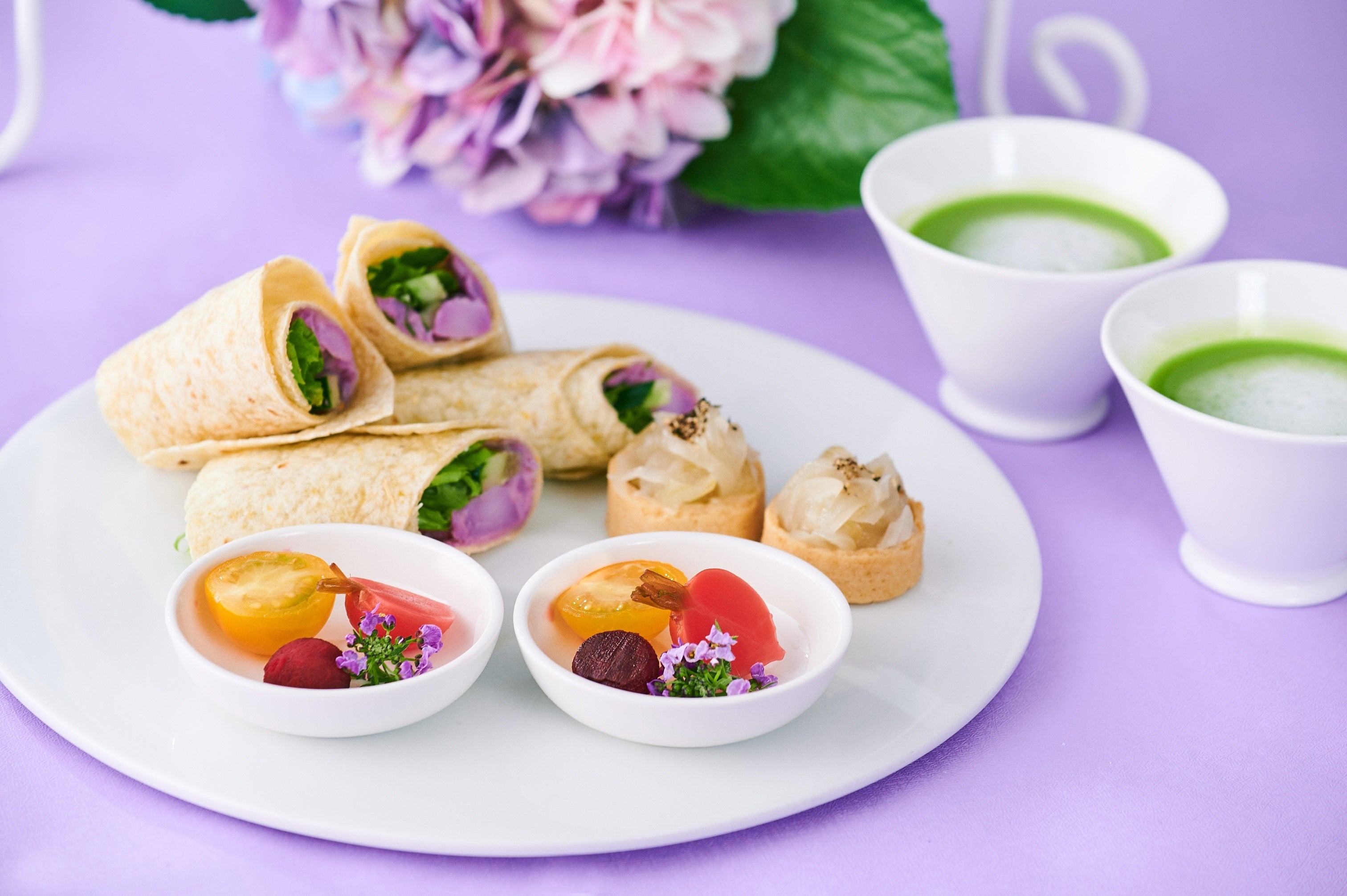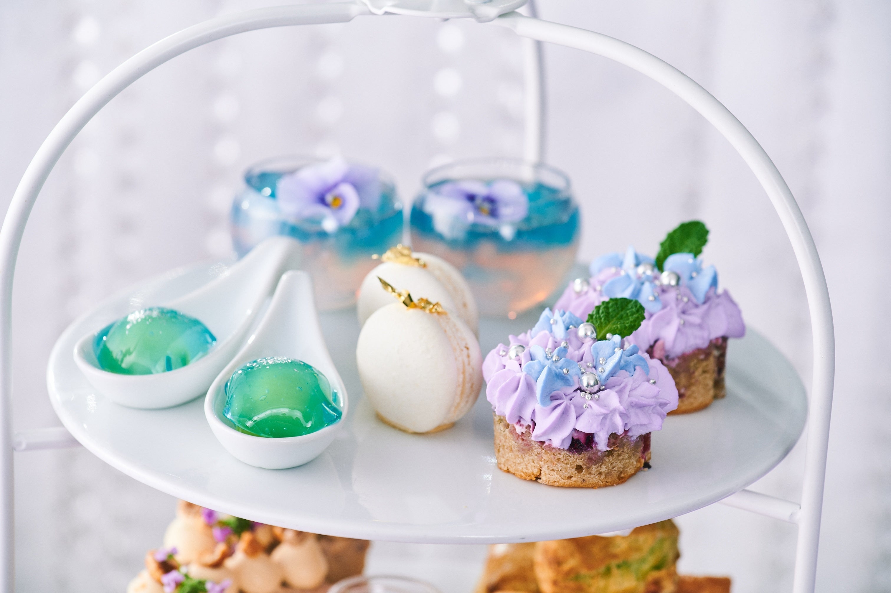 まるでお城のような外観の大聖堂を望むテラス席と、海をモチーフとしたバーが特徴的なラウンジ席を備えるラグジュアリーなラナイテラスでご堪能いただくのは、“紫陽花”の華やかな色合いと、香り豊かなお茶の風味をご堪能いただける「花咲く紫陽花アフタヌーンティー」。淡いブルーとパープルのクリームで紫陽花の花びらを表現したカップケーキや、雨に濡れた花のように美しく光るジュレなどの色彩が美しいスイーツに加え、和三盆のマカロン、ほうじ茶とアールグレイのパウンドケーキ、抹茶のクッキーシューなど和洋のお茶の風味が香るアフタヌーンティーを、2種のスコーン、軽食とともにご堪能いただけます。
