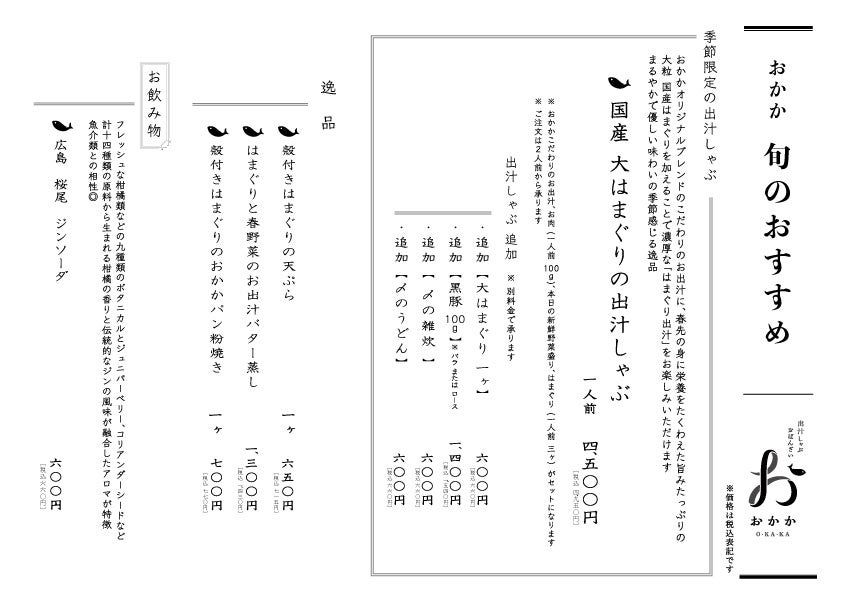 内 容: 大はまぐり(1人前3個)/お肉(1人前100g)/本日の新鮮野菜盛り/おかかこだわりのお出汁