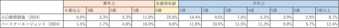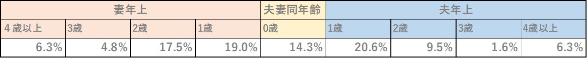 最も多いのは夫1歳年上のパターンですが、次いで妻1歳年上、妻2歳年上と続いています。