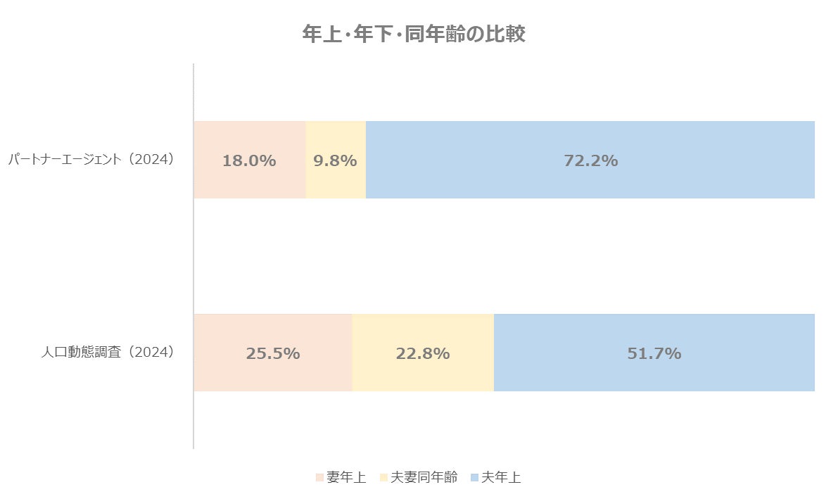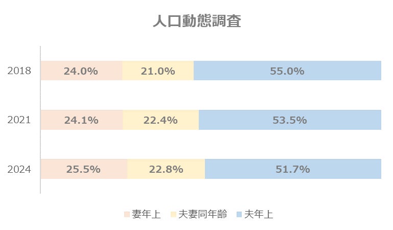 人口動態調査では「25.5%が妻年上婚」という結果に対し、結婚相談所では18.0%と、依然として夫年上の割合が高くなっています。