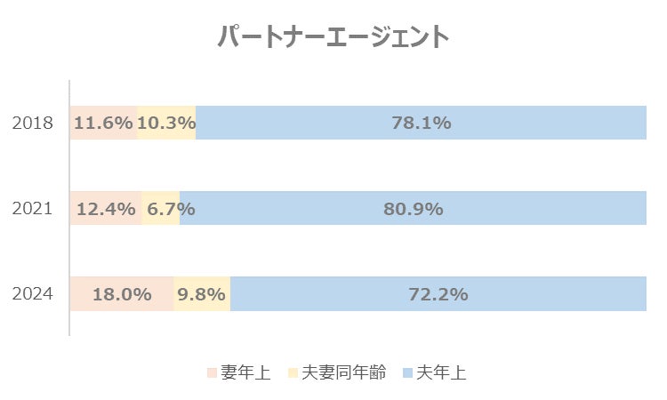 人口動態調査における妻年上婚は2018年の24.0%から2024には25.5%と1.5ポイントの増加となりました。一方、パートナーエージェントでは2018年の11.6%から2024年には18.0%へと6.4ポイントも増加しており、結婚相談所の方が妻年上婚のニーズを顕著に反映する結果となりました。