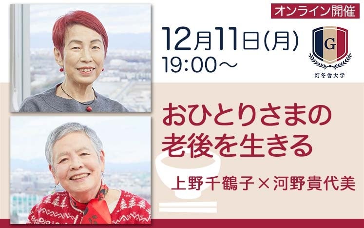 株式会社幻冬舎では、2023年12月11日(月)に社会学者の上野千鶴子氏とフェミニストカウンセリングのパイオニア、河野貴代美氏による「おひとりさまの老後を生きる」をテーマにしたオンライン講座を開催します。