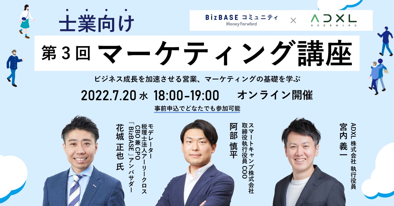 マネーフォワードグループのスマートキャンプ株式会社の子会社であるADXL株式会社は、税理士法人アーリークロスとマネーフォワード クラウド公認メンバー向けコミュニティ「BizBASE」と協働で「第3回 士業向けマーケティング講座」を2022年7月20日(水)18時からオンライン配信します。