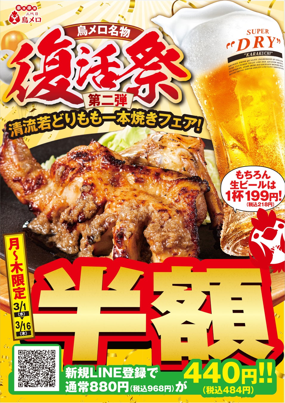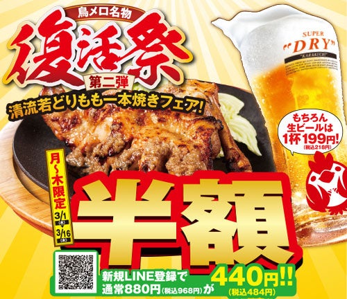 【三代目 鳥メロ】期間限定!まるごと「清流若どりもも一本焼き」が半額!もちろん生ビールは何杯飲んでも1杯199円!(税込218円)