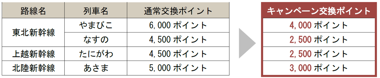 ・キャンペーン期間中、対象列車の「グランクラス(飲料・軽食なし)」が、通常よりも2,000ポイント割引でアップグレード可能となります。