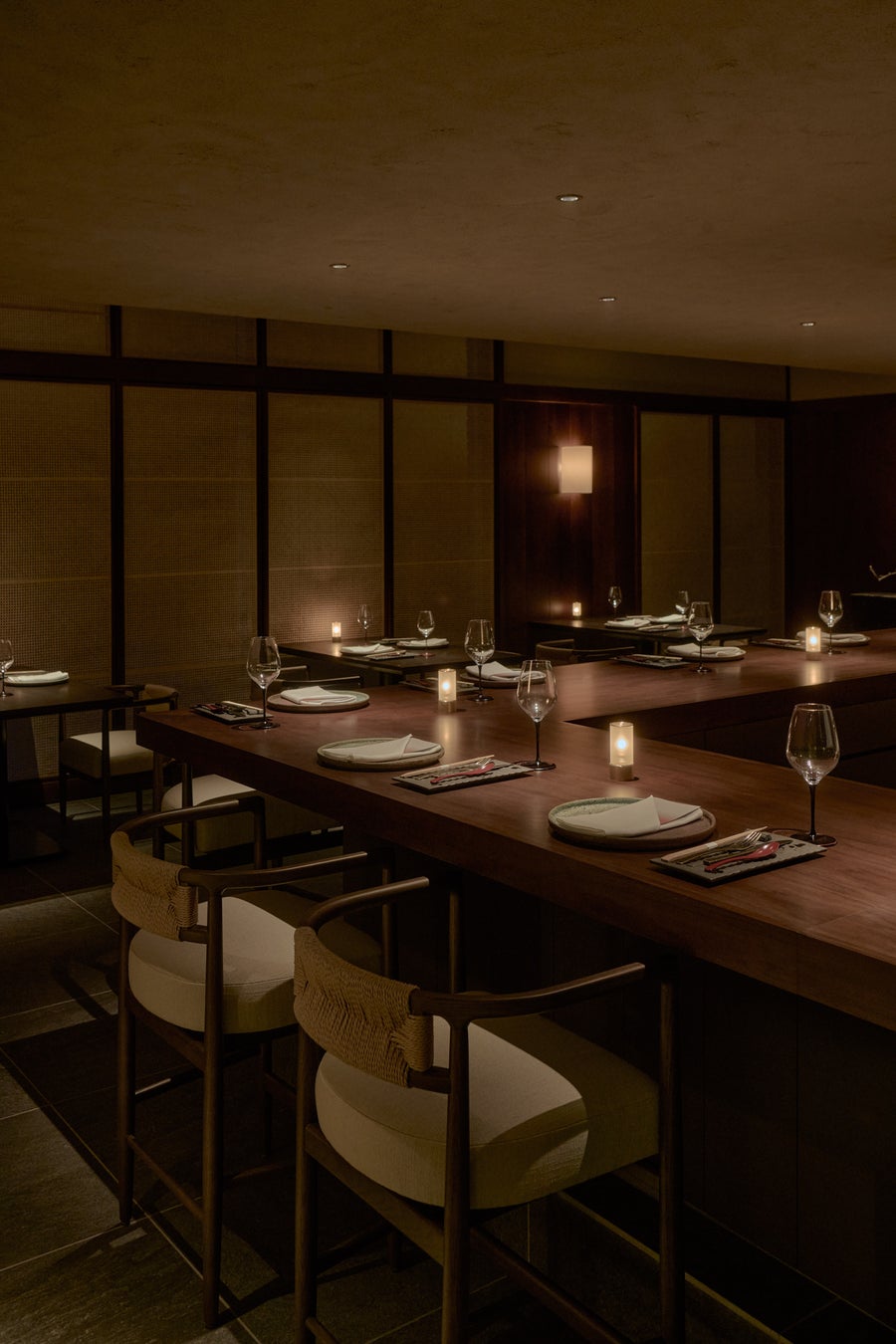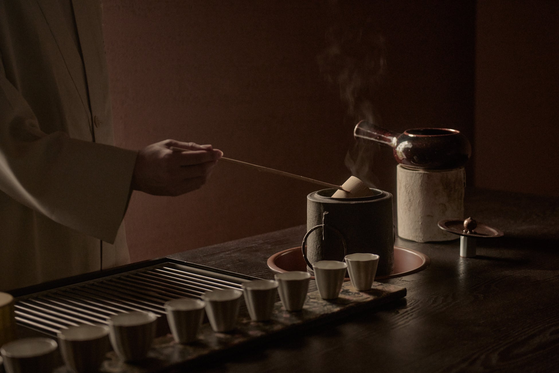 KÚON 箱根強羅のチェックインは13:00。和菓子作家 坂本紫穗氏が監修した和菓子と、こだわりのお茶とのマリアージュ体験〈菓席〉からホテル滞在が幕を開けます。舞台となるティーラウンジでは、スタッフがお茶を淹れ、和菓子とともに提供する空間や、自分でお茶を淹れて、ゆったりと自分時間を過ごすことができる空間があります。夕食後にはお酒を提供し、創作茶カクテルや、おやすみの和菓子をご用意しています。