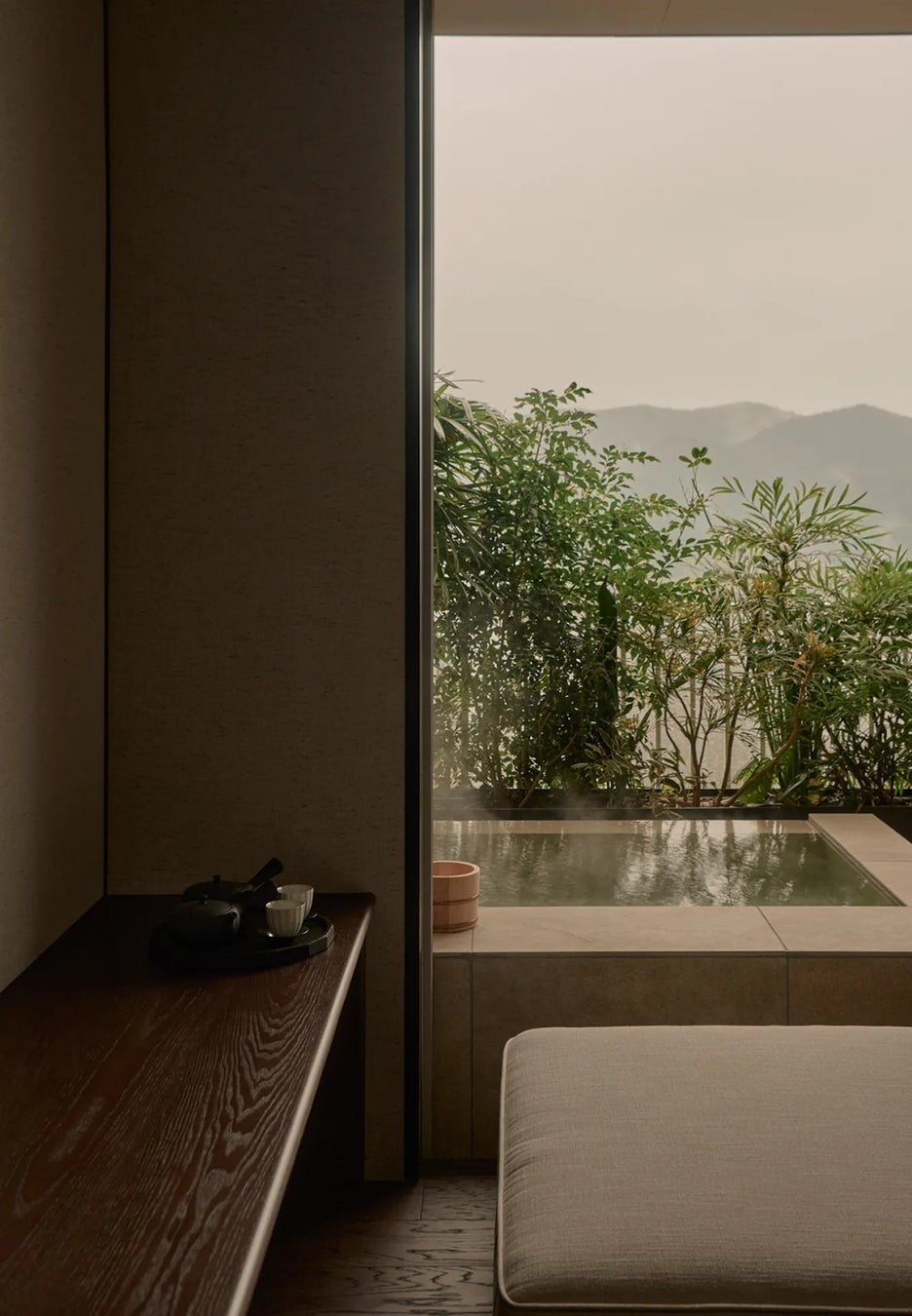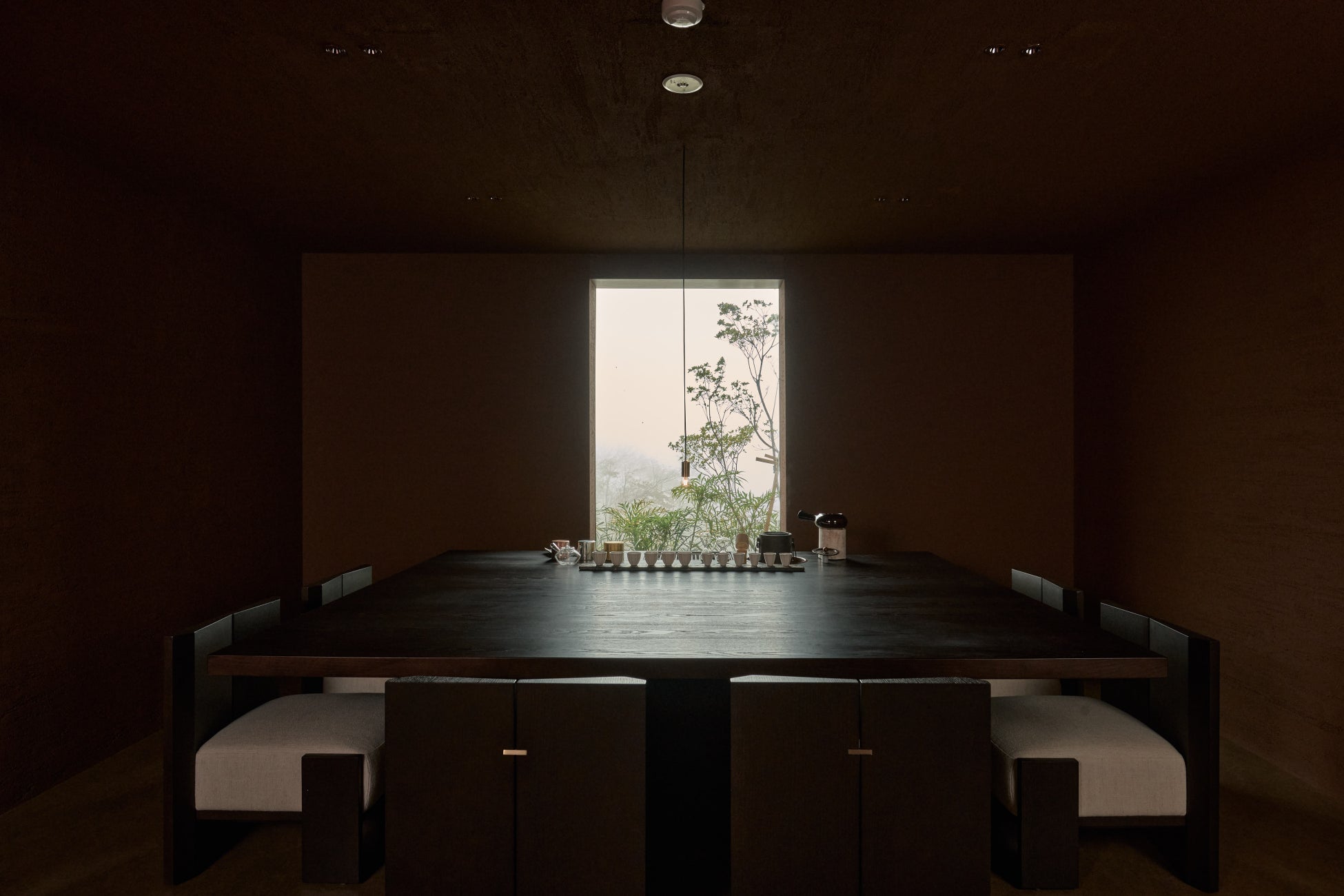 デザイナー永井健太氏をはじめとしたnegu inc.によって再構築(フルリノベーション)された空間には、個人旅行の嗜好を追求し各客室へのかけ流し温泉を設置するかわりに既存の大浴場を改装し、その空間を「tea lounge」として再構築するなど、コンセプトを体現する仕掛けを多数盛り込みました。大涌谷や芦ノ湖、美術館へのアクセスが良好で、温泉とアート、四季折々の自然を満喫できる箱根強羅に、今までにないオリエンタルな空間をデザインしています。