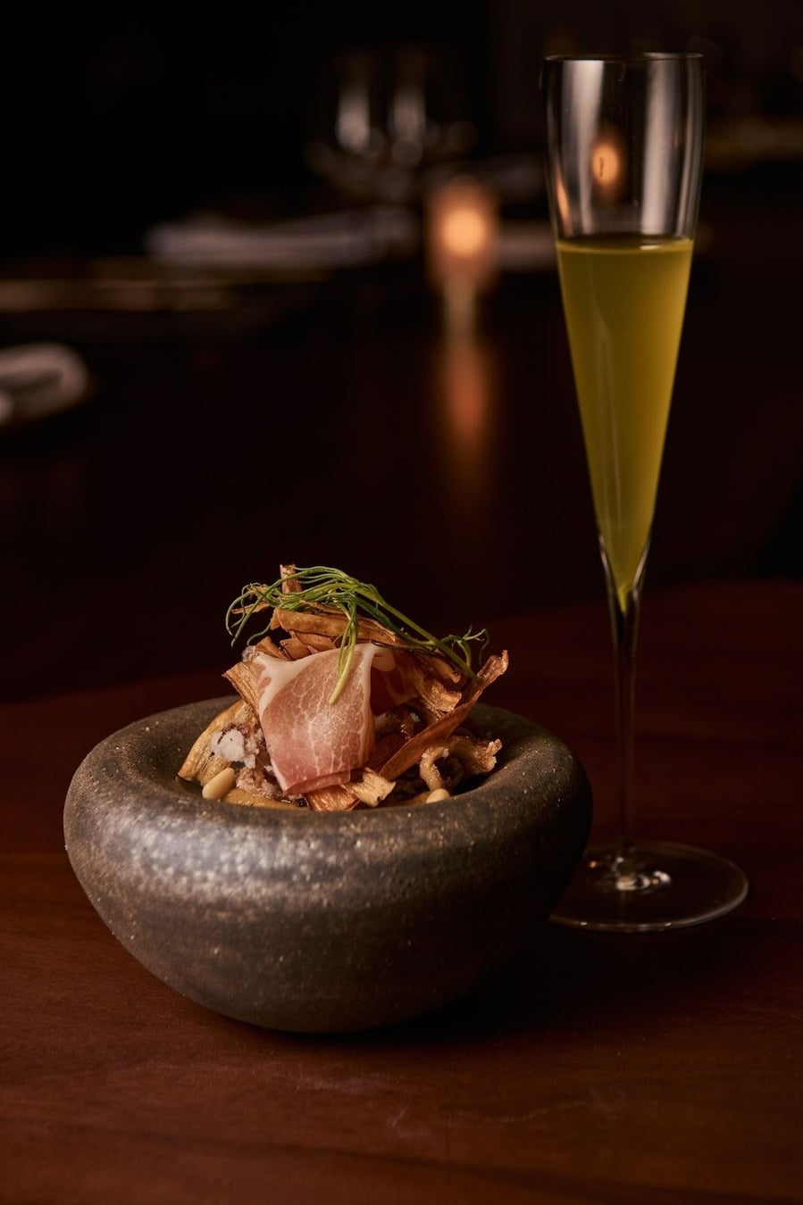夕食のテーマは、お茶や和菓子のエッセンスを取り入れたフレンチキュイジーヌ。炭火を用いて、食材本来の持ち味を引き出した創作コース料理をお届けします。