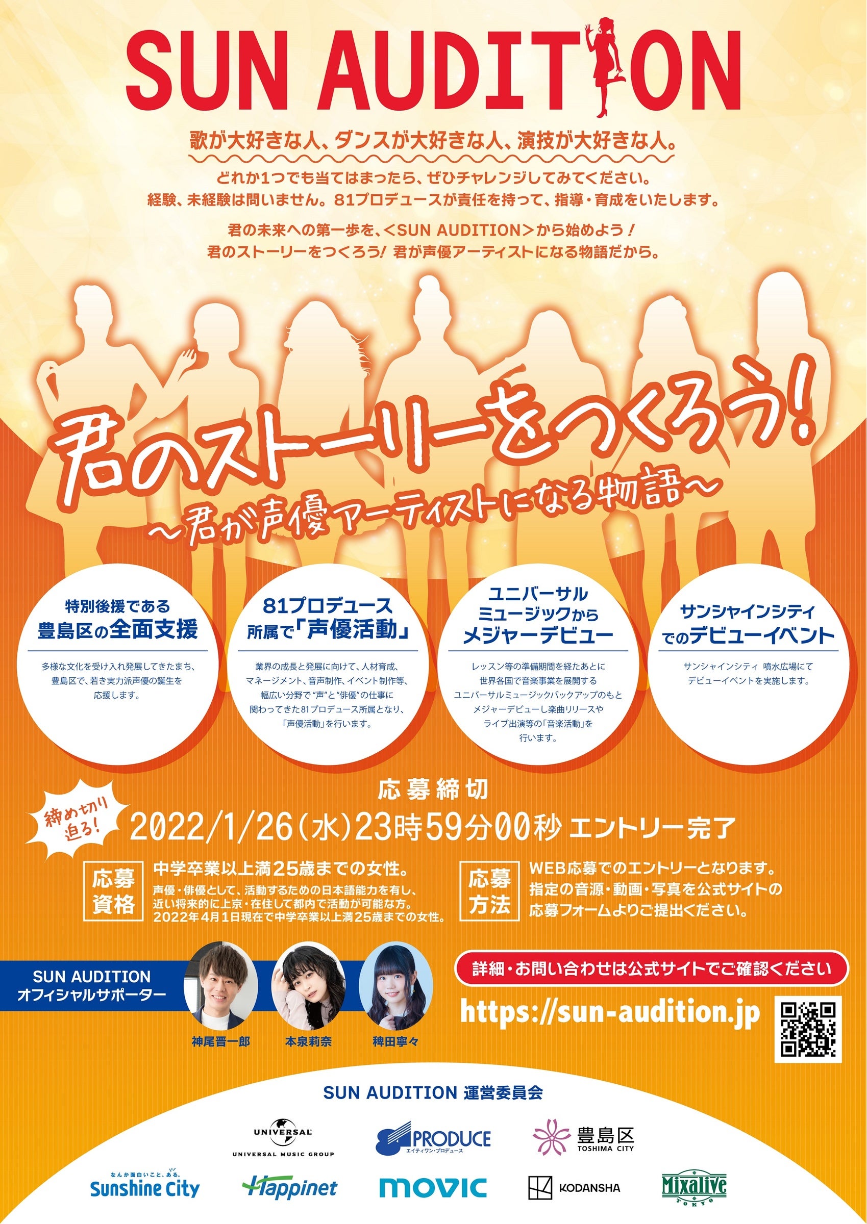 SUN AUDITION運営委員会は、株式会社81プロデュース、ユニバーサルミュージック合同会社と特別後援の豊島区に加えて、株式会社サンシャインシティ、株式会社ハピネット、株式会社ムービック、株式会社講談社、Mixalive TOKYOと合同で発足されました。声優アーティストを目指す皆さんのチャレンジをサポート・応援します。