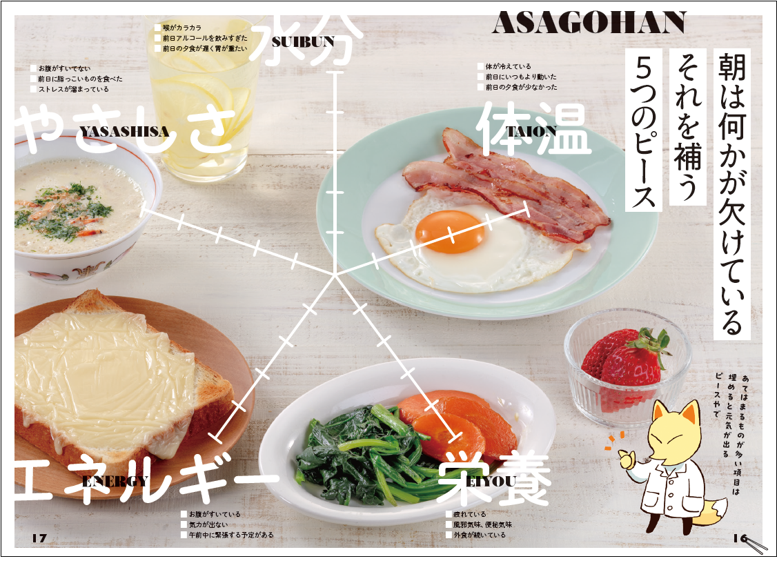 「朝ごはん」というと、実際何を食べたらいいのかわからないという人が多いのではないでしょうか。実はその答えは「朝起きたときの自分の体」が教えてくれているのです。約7時間の睡眠を経たあとの体は必ず“失われたピース”が存在しています。たとえば、朝起きて「気力が出ない」なら「エネルギー」のピースが、「お腹が空いていない」なら「やさしさ」のピースが足りていないなど。そんな足りていないピースを埋める役割なのが朝ごはんです。毎日同じものを食べる必要はなく、朝起きたときのコンディションに合わせて体が足りていないものを朝ごはんで食べればよいのです。