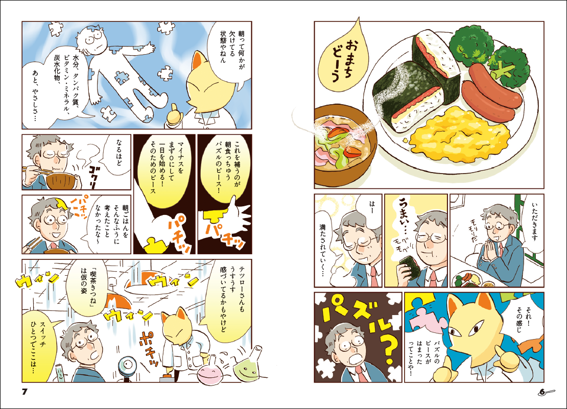 人気漫画家・スケラッコさんによる本作描きおろし漫画では、60代・一人暮らしのテツロ―さんが、朝ごはんを食べに立ち寄った喫茶店(実は「朝ごはん研究所」!)で、朝食や栄養についての知識を学んでいきます。漫画部分を読み進めるうちに、楽しく学べて実際につくってみたくなるはずです!