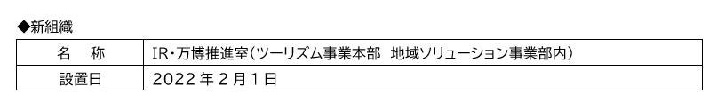 株式会社JTBは、中期経営計画「『新』交流創造ビジョン」のもと、旅行者や多様な事業者との共創により、エリア・地域の持続的な発展を希求し続け、それを実現する存在になることを目指し、2022年2月1日付で、ツーリズム事業本部 地域ソリューション事業部内に「IR・万博推進室」を新設します。