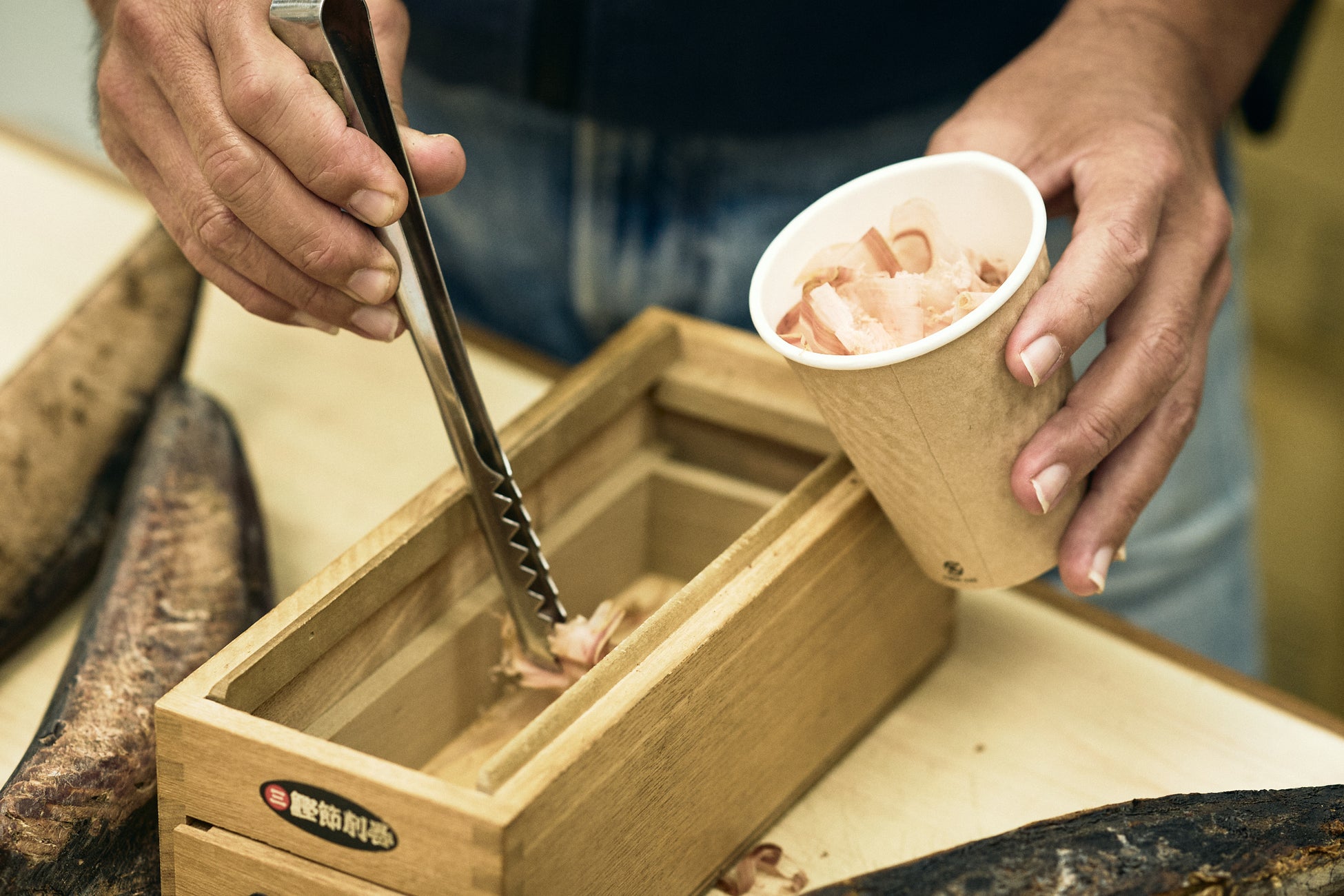 「那覇市第一牧志公設市場」や周辺店舗を巡りながら沖縄の食文化を体験をします。例えば、琉球王朝時代に生まれた宮廷料理の一つ「ジーマーミ―豆腐」の製造工程を、創業50年のお店で試食をしながら学んだり、鳴き声以外は全て食べると言われるほど県民に馴染み深い“豚肉”の部位を、お肉屋さんで沖縄の方言で習ったり、沖縄のソウルフード「カチュー湯」を、老舗の料理店御用達の鰹節店で作って食べたりします。どれも店主と顔なじみのOMOレンジャーと巡るからこそできるツアーならではの食体験です。
