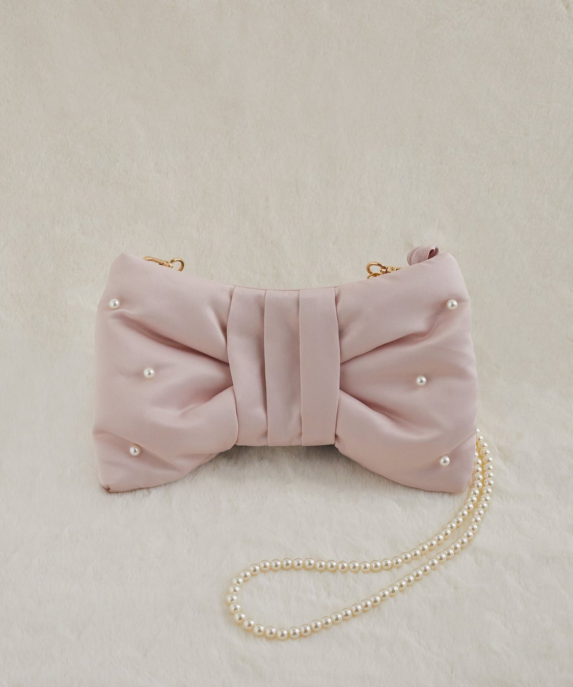 “ピンクリボン”をモチーフにしたアイコニックなショルダーバッグのパールチェーンのショルダーは取り外し可能で、クラッチバックとしても活用いただけます。ふわふわのリボンの形状が可愛らしい一押しのアイテムです。