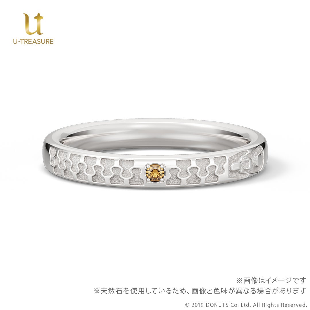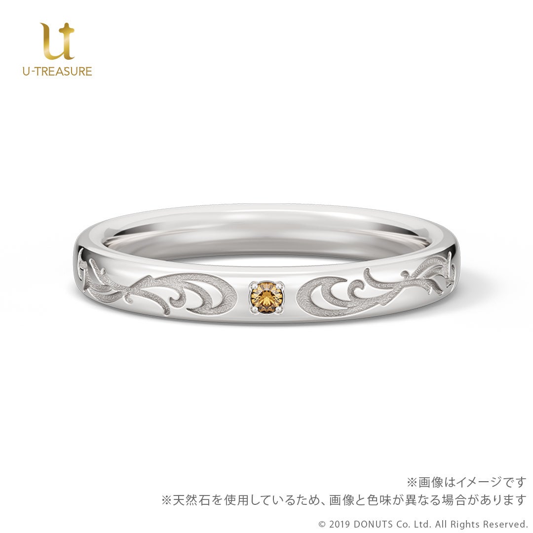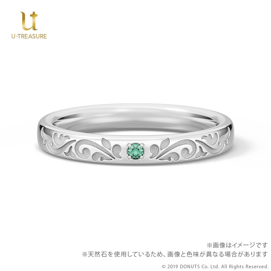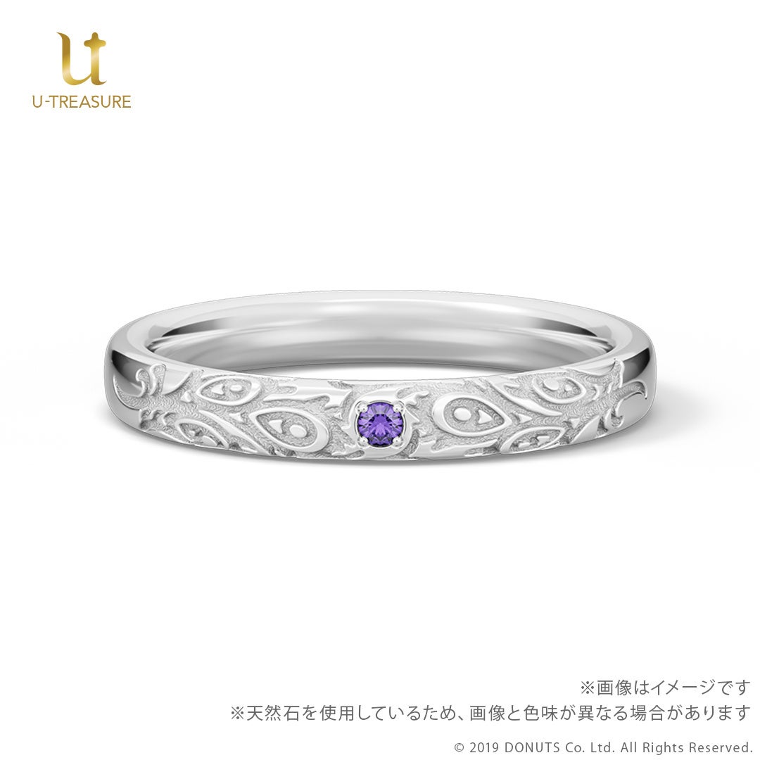 このたびの新作は、『ブラックスター -Theater Starless-』のキャストをモチーフにしたリング(指輪)です。中央にキャストをイメージした天然石を留め、内側には名前を刻印したデザインです。