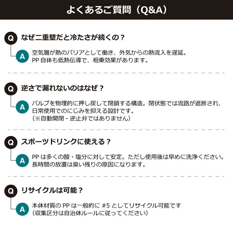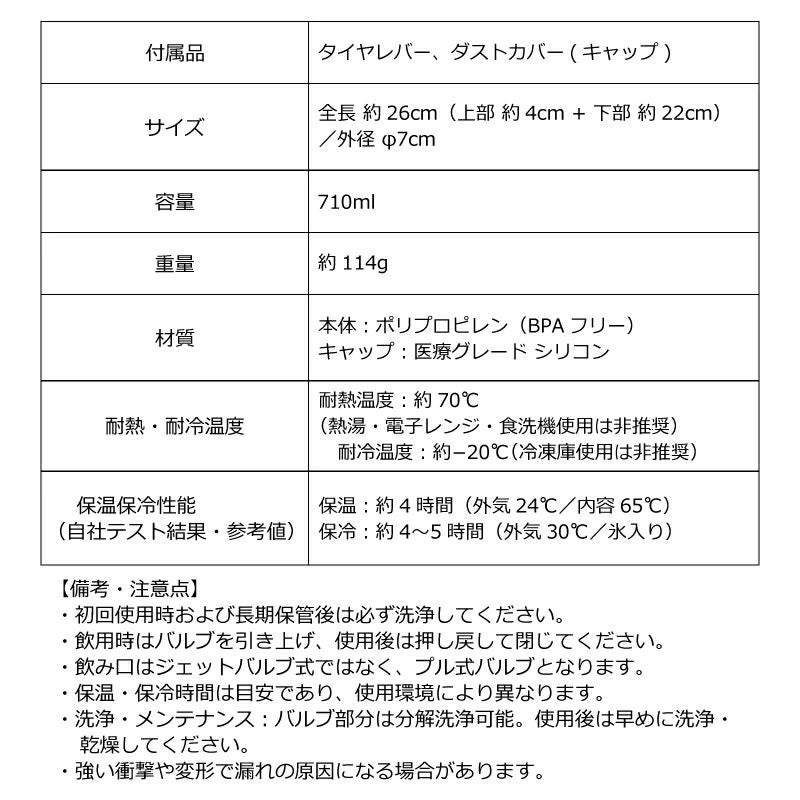 ・初回使用時および長期保管後は必ず洗浄してください。 ・飲用時はバルブを引き上げ、使用後は押し戻して閉じてください。 ・飲み口はジェットバルブ式ではなく、プル式バルブとなります。 ・逆止弁は非搭載ですが、逆さにしても漏れにくい設計。 ・保温・保冷時間は目安であり、使用環境により異なります。 ・冷凍庫に入れると破損の恐れがあります。 ・炭酸飲料・熱湯の使用は推奨しません。 ・食洗機可/不可・電子レンジ不可。 ・洗浄・メンテナンス:バルブ部分は分解洗浄可能。使用後は早めに洗浄・乾燥してください。 ・強い衝撃や変形で漏れの原因になる場合があります。
