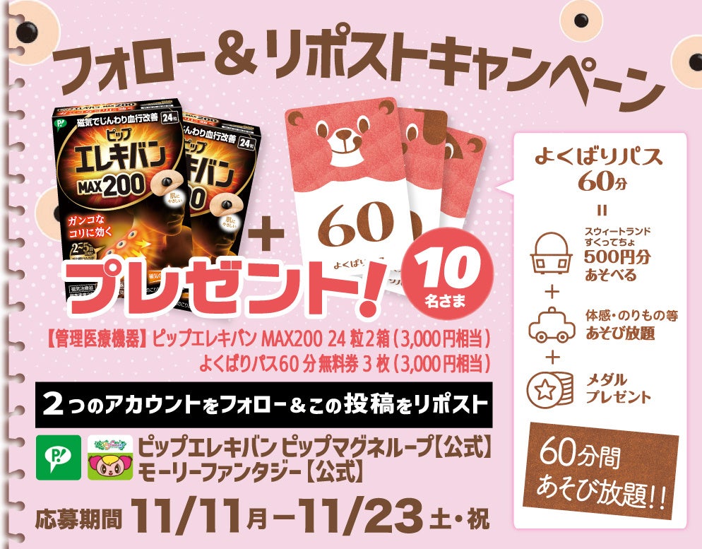 モーリーファンタジー公式Xおよびピップエレキバン ピップマグネループ公式Xの2アカウントをフォローし、指定の投稿をリポストしていただいた方の中から抽選で合計10 名さまに「よくばりパス」60分を3枚&『ピップエレキバンMAX200』(24粒入り、管理医用機器)2箱をプレゼントいたします。