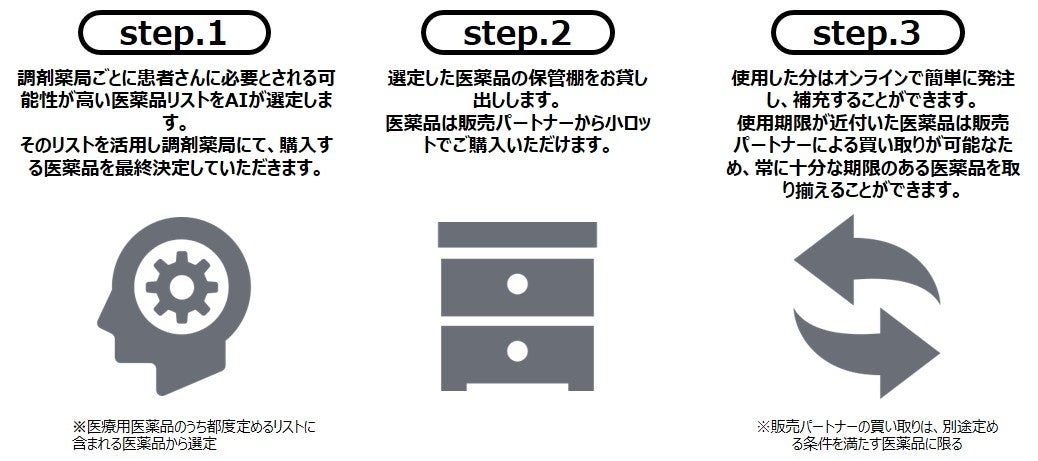 「premedi」は、AIで薬局ごとの医薬品の利用確率を予測し、10~30錠の小ロット単位で約100種類の医薬品を発注できる調剤薬局向け置き薬サービスです。各調剤薬局の中で特に取り扱い頻度の低い医薬品を適切に在庫管理できることが特長で、使用期限が近付いた医薬品は「premedi」が買い取り、新たな医薬品に入れ替えます。