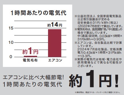1時間あたりの電気代は、エアコンの約14円に対して電気毛布は約1円。エアコンと比較すると大きな節電効果があり、暖房費が気になるこの冬にぴったりの商品です。
