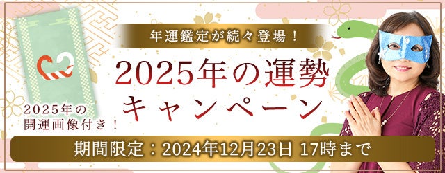 『2025年の運勢キャンペーン』では、2025年の運勢を占う鑑定が続々登場。この対象鑑定をご購入された方全員に、2025年の干支 “巳(蛇)”がモチーフの「2025年の開運画像」をプレゼント致します。 「不老長寿」を象徴し、神の使いとして信仰されてきた“巳(蛇)”が描かれた開運画像です。ぜひこの機会にGETして、2025年の運気アップにお役立てください。
