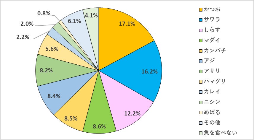 「かつお」が17.1%で1番好まれています。春告魚と言われることもある、「さわら」が16.2%、「しらす」は12.2%です。4番目以降についてはあまり差が見られませんでした。
