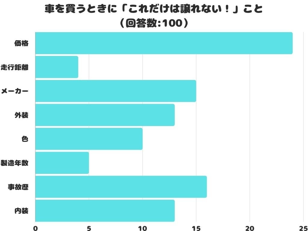 車を買うときに「これだけは譲れない!」というポイントをアンケートにて調査したところ、1位は「価格」でした。
