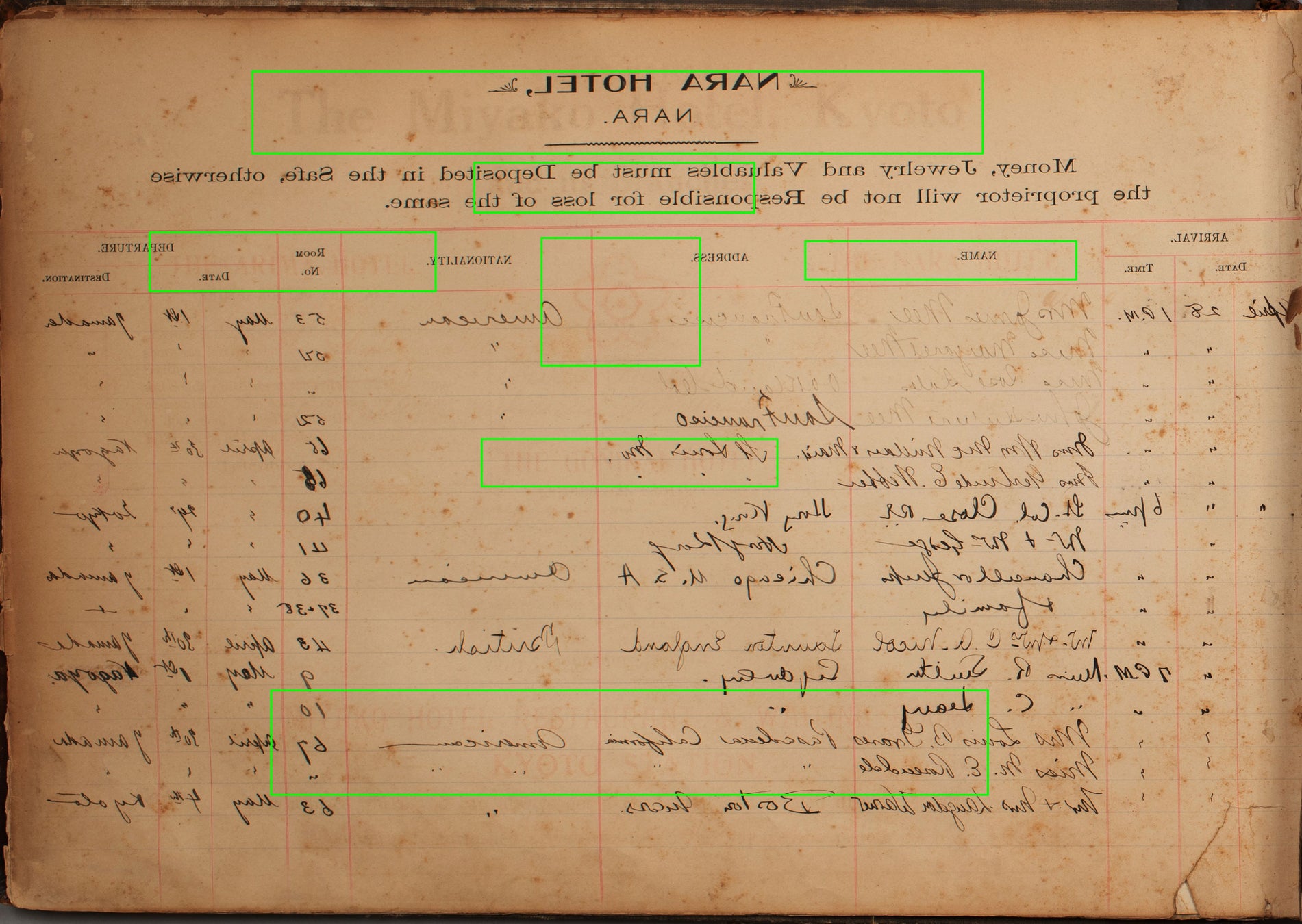 このインク吸い取り紙は、各ページの間にある破られた痕跡と、ほぼ全てのページに文字が反転して写っている箇所が見られたことから発見されました。さらに画像ソフトを用いて色調やコントラストを調整した結果、吸い取り紙に書かれていた文字の復元にも成功いたしました。また、この紙には当時のグループホテル名が全て記されていたことから、インクを吸い取ることだけではなく、チェーンホテルの宣伝も兼ねていたと考えられます。