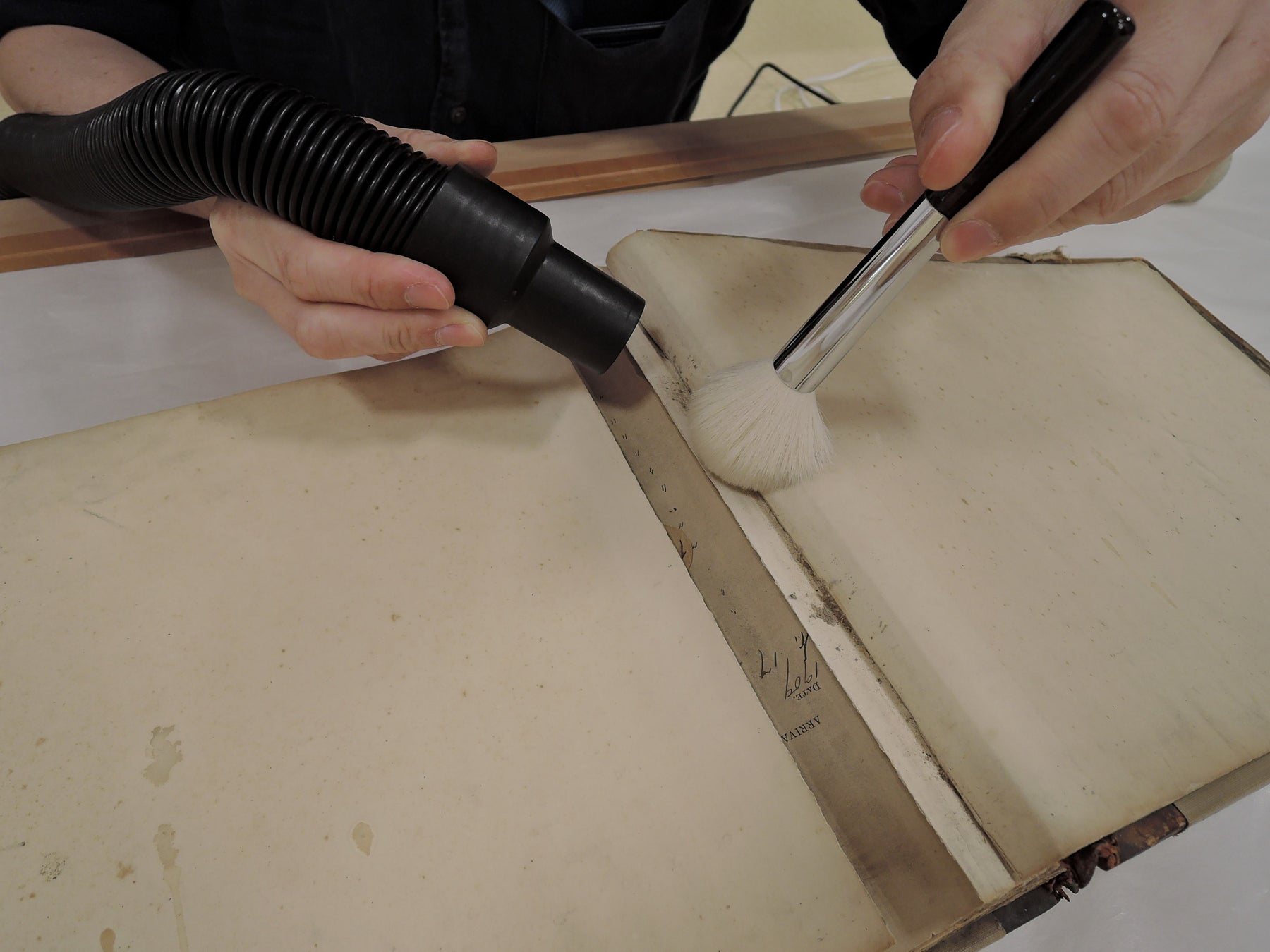この度、レジスターブック帰還を記念して、本館ロビー前ショーケースのデザインをレジスターブック仕様に刷新。修復作業のパネル展示や、修復中に発見されたインク吸い取り紙(復元)も展示しています。