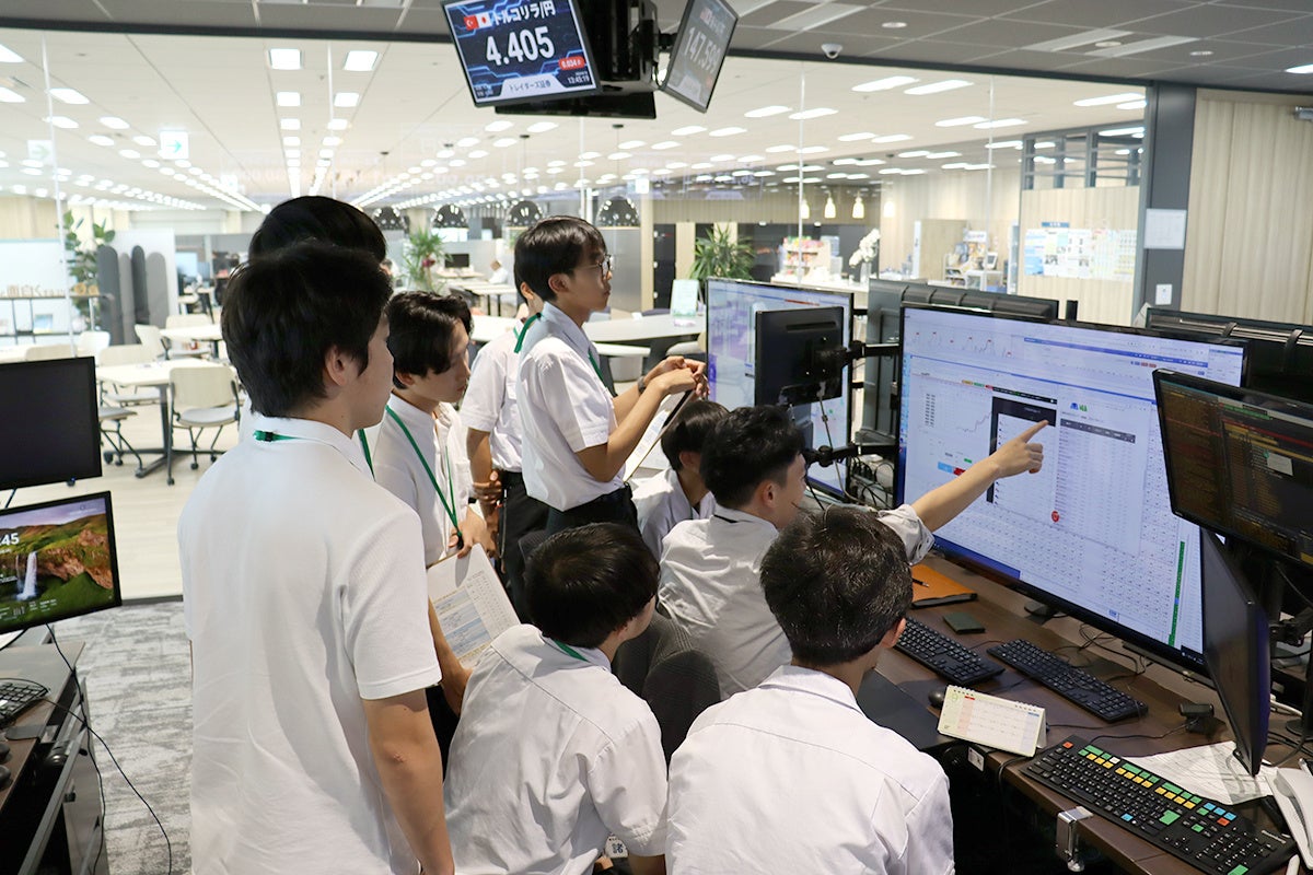 プログラム冒頭のオリエンテーションで当社グループの事業内容と一日の流れの説明を受けた後、参加高校生は若手社員からなるメンター(市場部為替ディーラー)の職場であるディーリングルームに席を移し、実際の日々の業務の様子をメンターのすぐそばで観察しつつ、予め準備していた質問や新たに浮かんだ疑問点をメンターに投げかけていました。「みんなのFX」のデモトレード(https://min-fx.jp/start/demotrade/) を利用した模擬取引では、初めての経験に戸惑いを見せつつも参加者同士で意見を交わしながら真剣に取り組む様子が見られました。