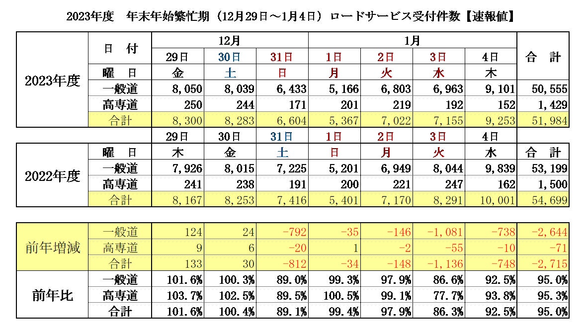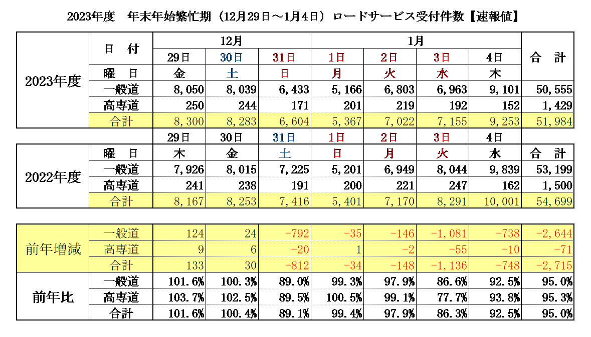 JAF(一般社団法人日本自動車連盟 会長 坂口正芳)は、年末年始期間(2023年12月29日~2024年1月4日まで)のロードサービス受付件数(速報値)をまとめました。