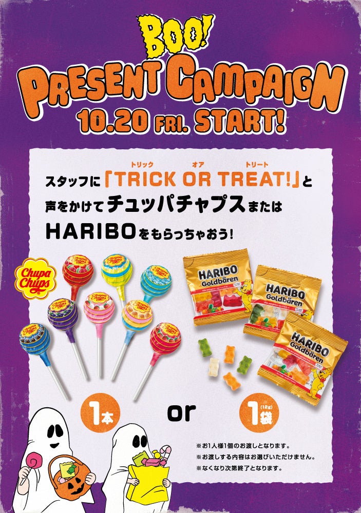 全国のPLAZA・MINiPLAで、店頭スタッフに“トリック オア トリート!”と声をかけていただくと、チュッパチャプス(1本)またはHARIBO ミニゴールドベア小袋(1袋)をプレゼントします。