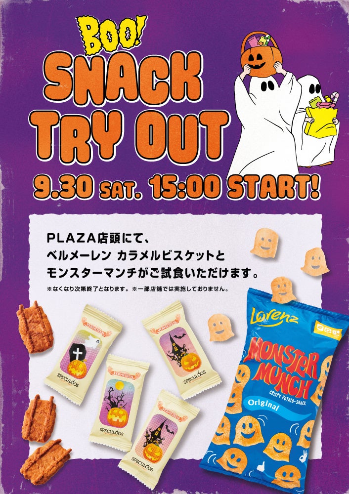今年は、全国のPLAZA・MINiPLAでハロウィンの店頭イベントを開催!9月30日(土)15:00~16:00、ハロウィン気分を食べて味わえる試食イベント「BOO! SNACK TRY OUT」を各店舗で実施します(※一部店舗を除く)。そして10月20日(金)からは、“トリック オア トリート!”とスタッフにお声掛けいただいた方にお菓子をプレゼントするキャンペーン「BOO! SNACK TRY OUT」を開催!
