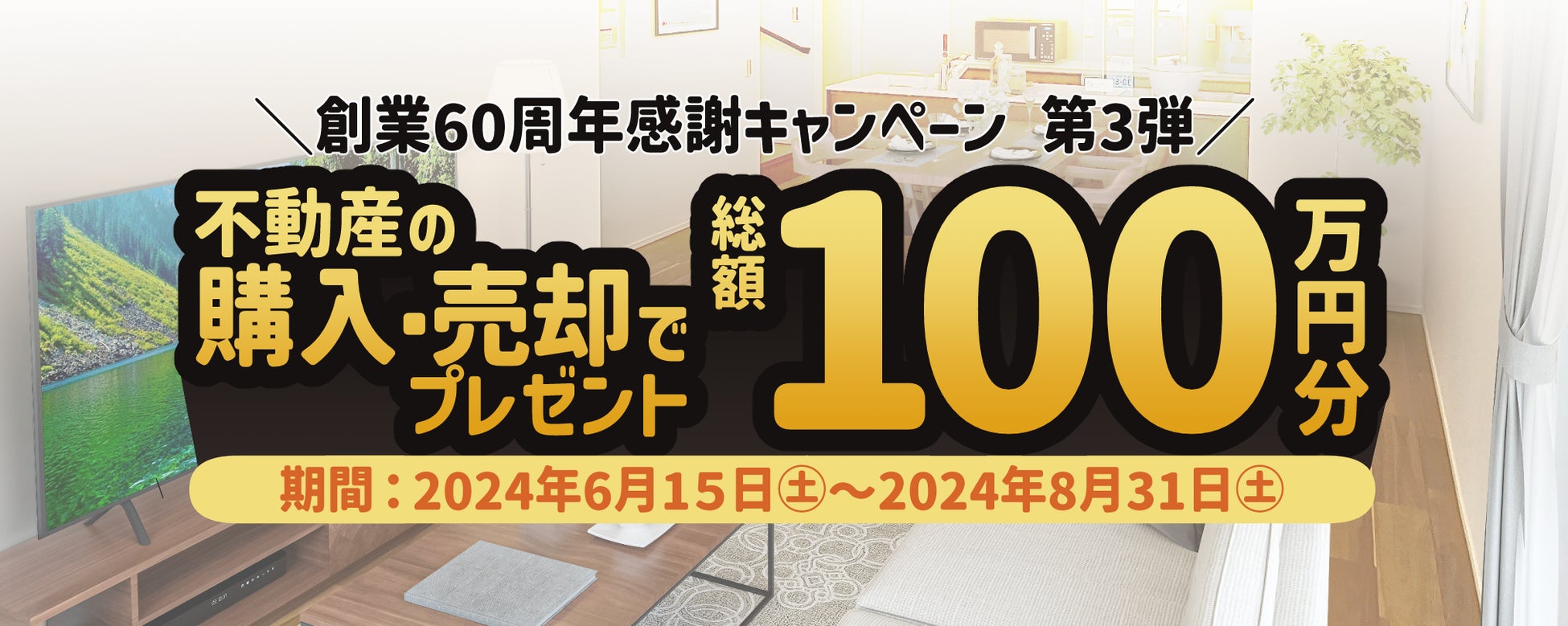 本キャンペーンの第3弾では、期間中にクラスコを通じて不動産の購入・売却をされたお客様に、総額で「100万円分」のプレゼントをが当たる」を提供いたします。これまでの60年間、地域の皆様に支えられてきた感謝の気持ちを込めて、少しでも恩返しができるよう努めてまいります。