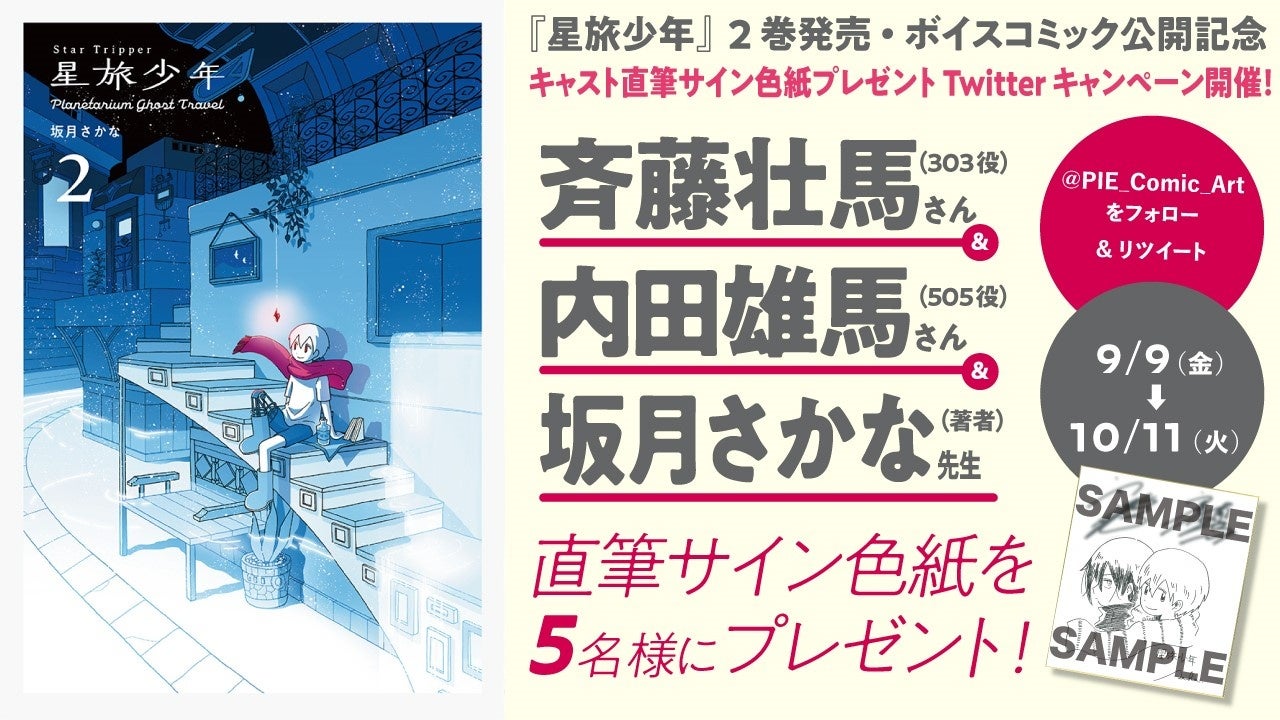 『星旅少年』2巻発売・ボイスミックの公開を記念して、ボイスコミックに出演頂いた303役:斉藤壮馬さん、505役:内田雄馬さん、そして著者の坂月さかな先生、3名の直筆サインの入った色紙(303&505のイラスト入り)を抽選で5名様にプレゼントするキャンペーンを実施いたします。
