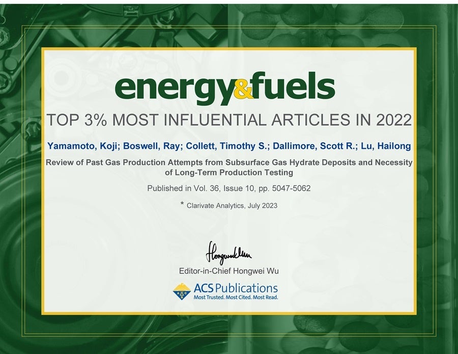 このたび、当機構エネルギー事業本部副本部長 山本 晃司が第一著者・責任著者として、海外の研究者とともに2022年に発表した、MH21-Sおよび各国が行ったメタンハイドレート層からのガス産出試験に関する論文が、米国化学会の出版するEnergy and Fuels誌において、2022年出版論文の高影響度(高被引用)論文(top 3% most influential articles)として表彰されました。